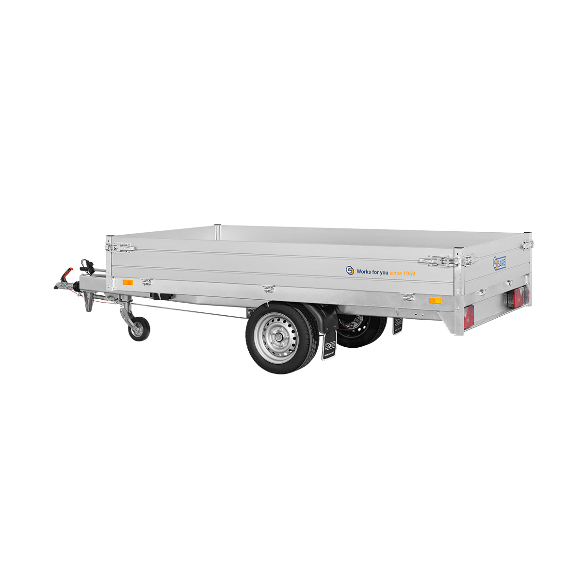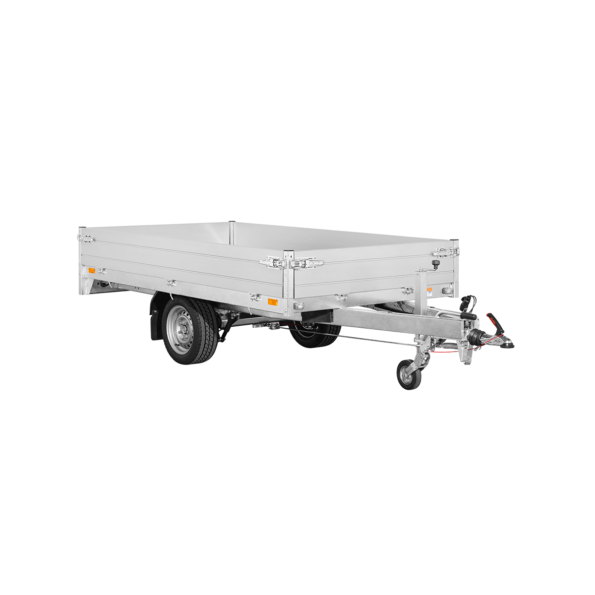 Chassis verzinkt, Aluseitenläden 30 cm hoch mit Einbauverschlüssen, 4-seitig klappbar, Siebdruckboden, 4 – 10 Bindepunkte,