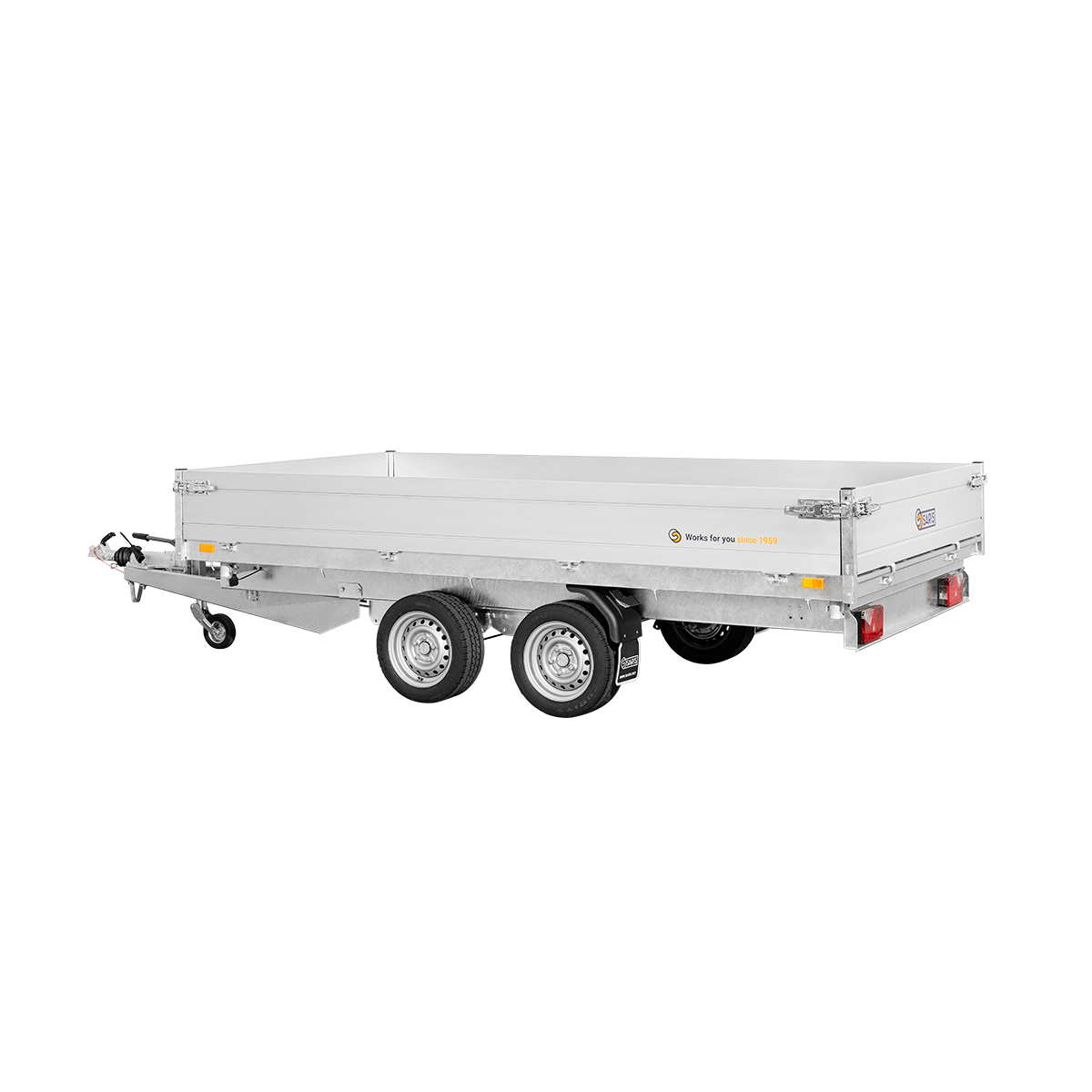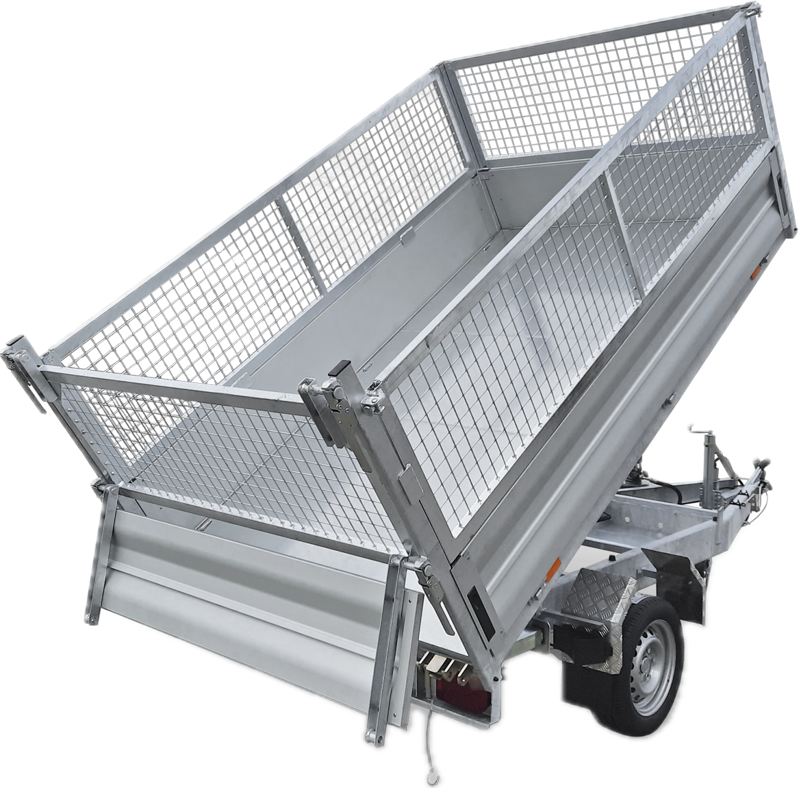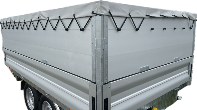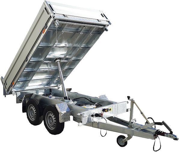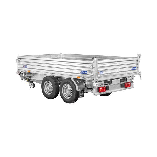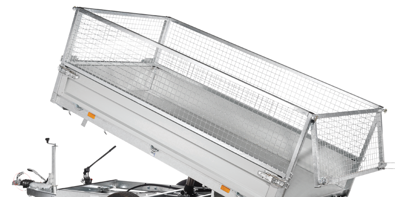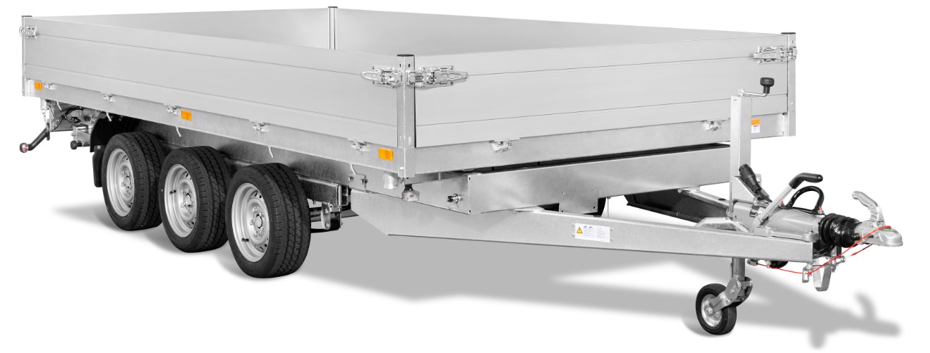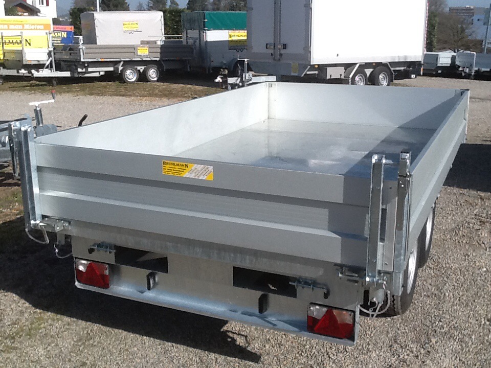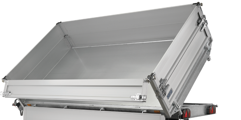 Chassis verzinkt, Tandem, Räder unter der Brücke, Alubordwände 35 cm mit versenkten Verschlüssen, 4-seitig abklappbar