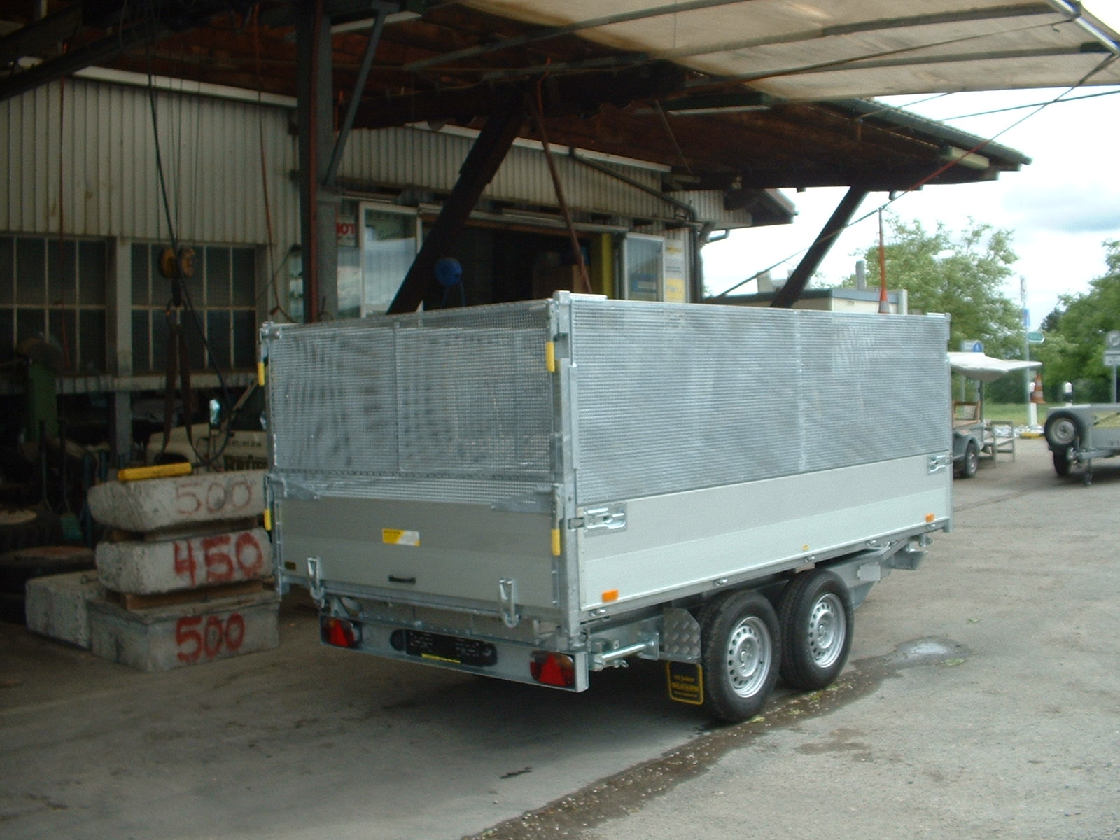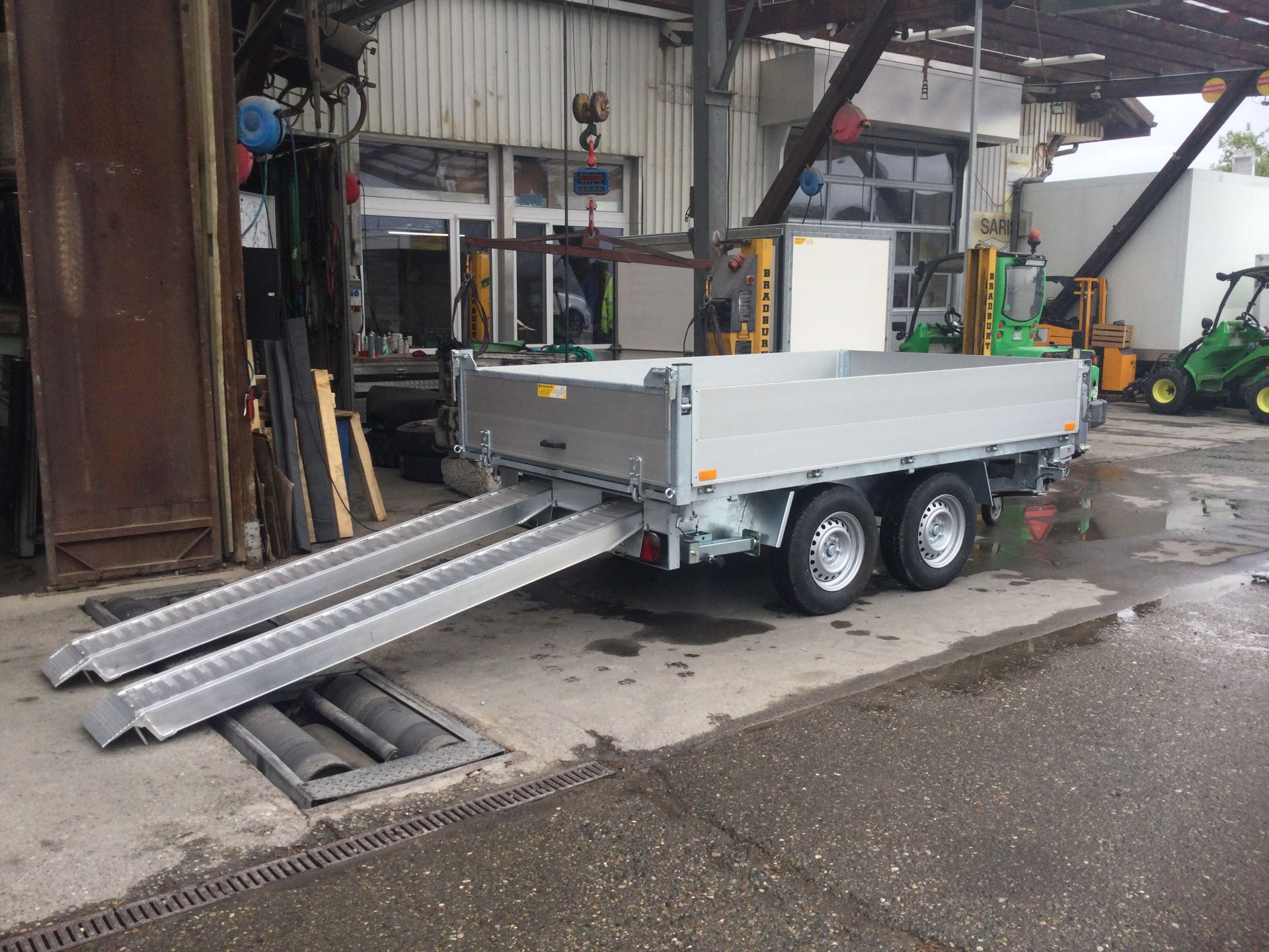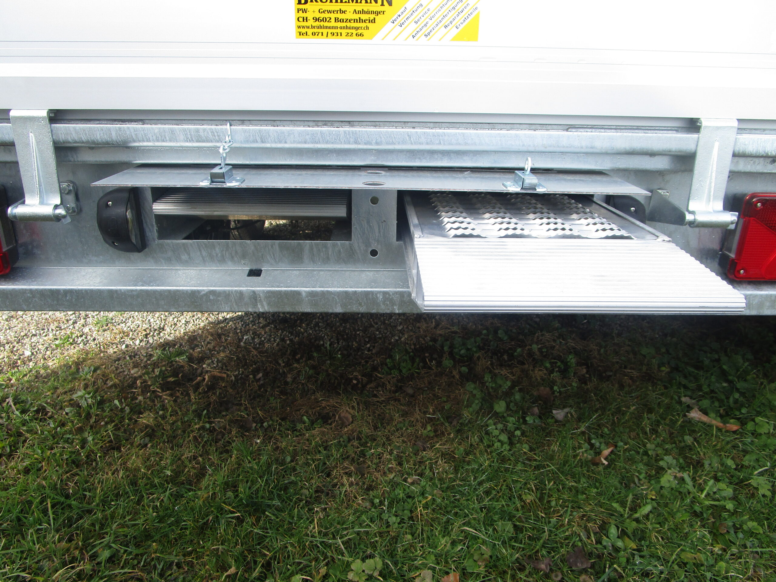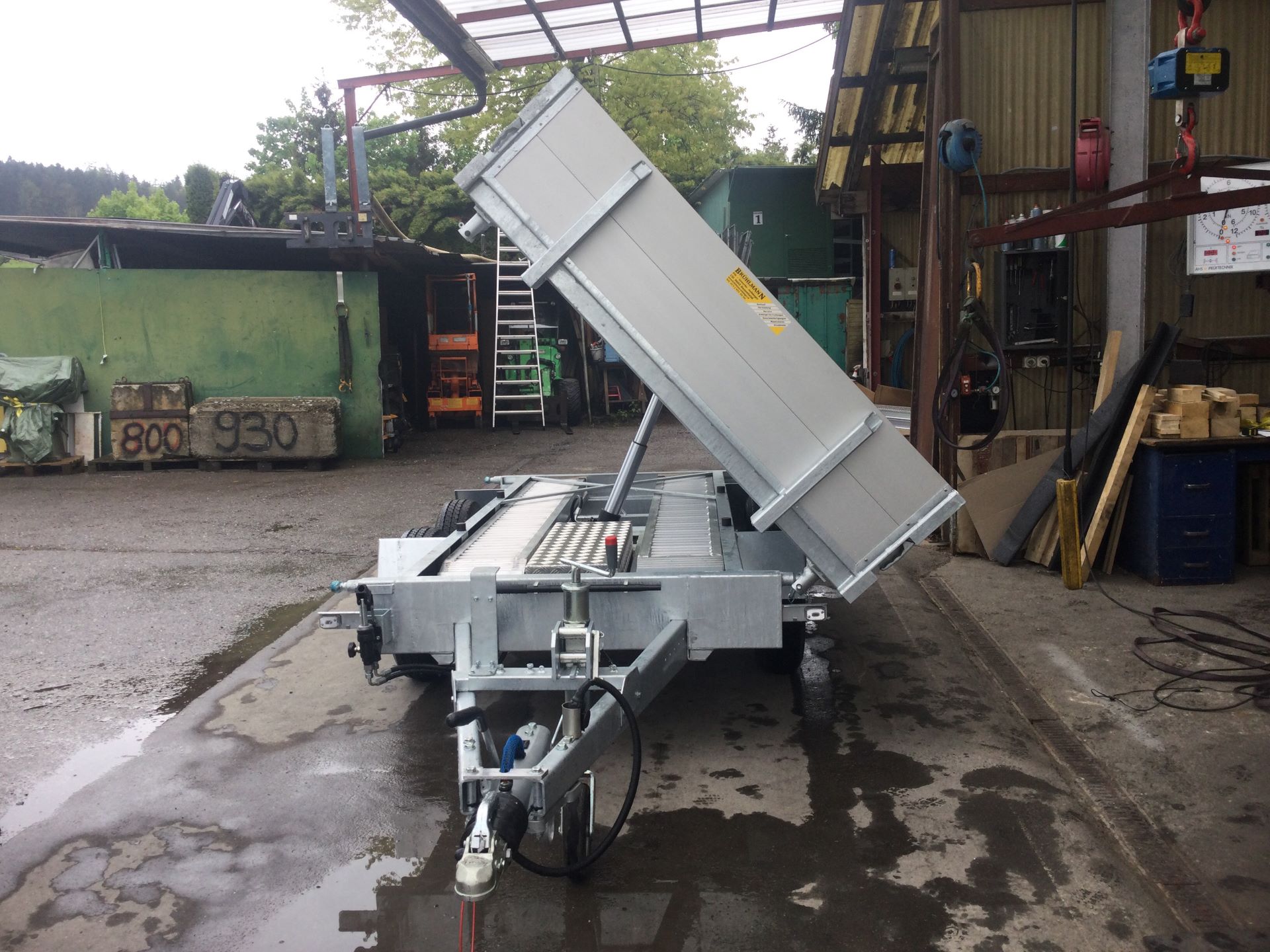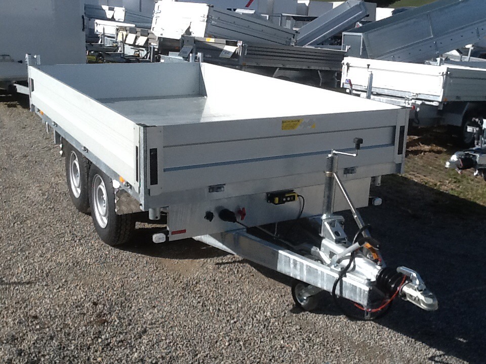 Stahlblechboden mit versenkten Bindenringen, Brückenhöhe 77 cm, Kippwinkel 45 °, Auflaufbremse mit Rückfahrautomatik,