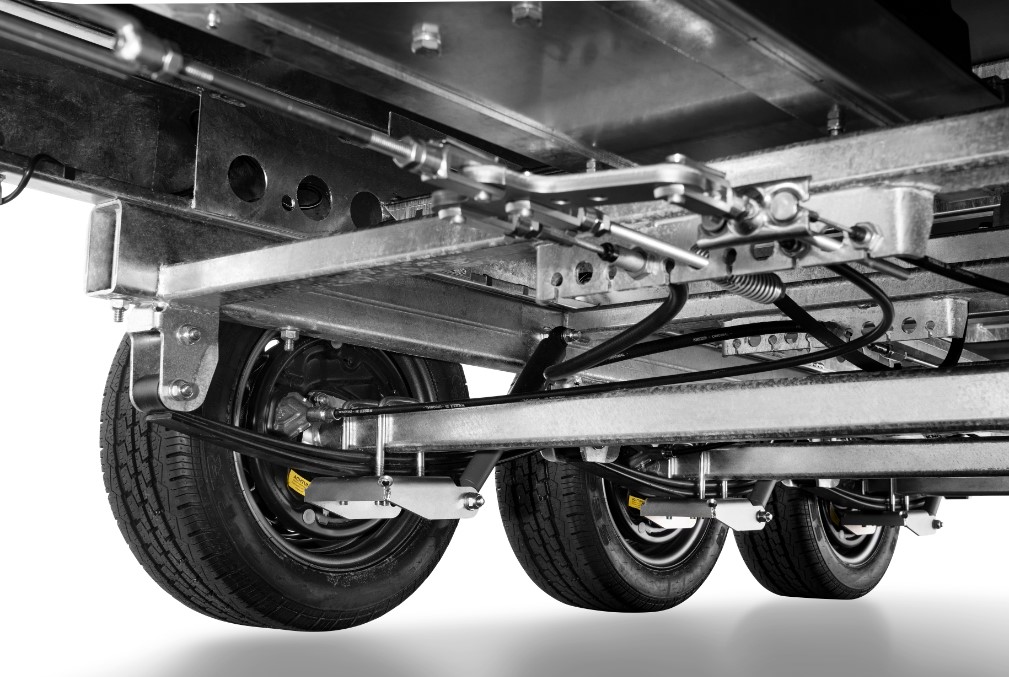 Chassis verzinkt, Auflaufbremse mit Rückfahrautomatik, Tandem, Räder unter der Brücke,