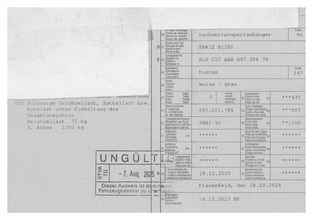| 12249 | Saris B 1350 | TL Kasten EA Holzwände/boden hi Flügeltüre 2 Stützen 1 Tablar Stützrolle MFK 12.23 ab Platz mehr... | 1350 kg | 435 kg | 251 x 132 x 150 cm | 12.23 | 3'100.- |