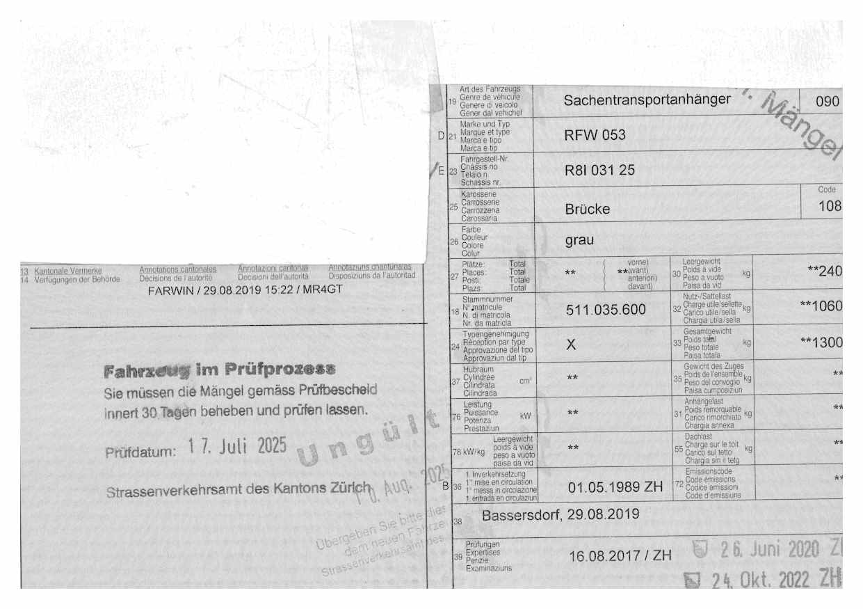 | 12595 | RFW 053 | Tieflader EA Holzläden + Aufsatz hi Rampe Holzboden SR muss zuerst MFK, ab Platz mehr... | 1300 kg | 240 kg | 248 x 130 x 40 + 50 cm | 05.89 | 550.- |