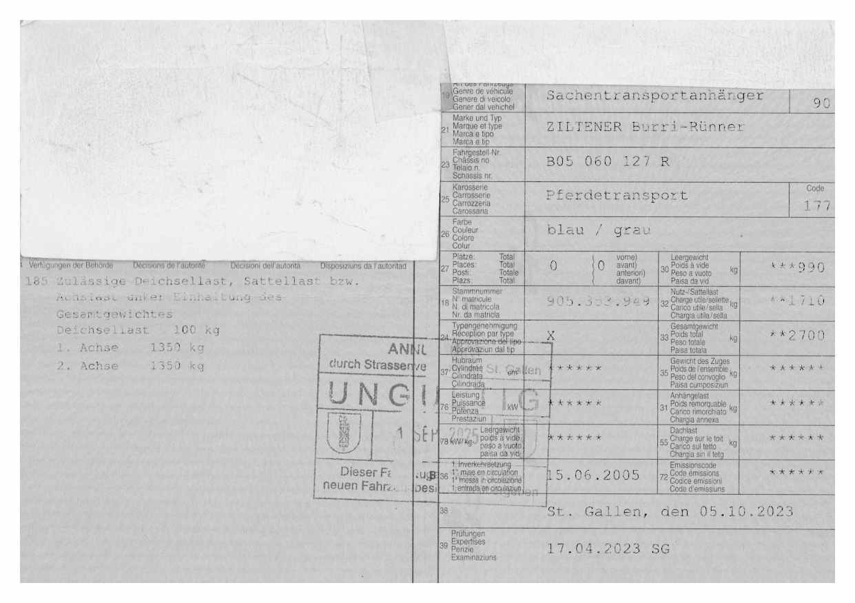 | 12599 | Ziltener Burri Rünner | TA TL 2erPferde Poly Abtrennung Sattelkammer Boden faul Stützrolle Reserverad ab Platz mehr... | 2700 kg | 990 kg | 260 x 160 x 220 cm | 06.05 | 990.- |