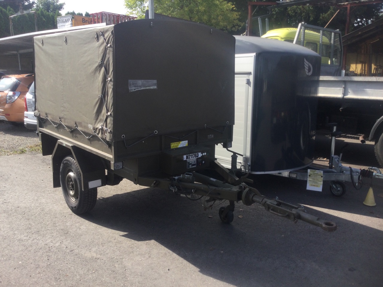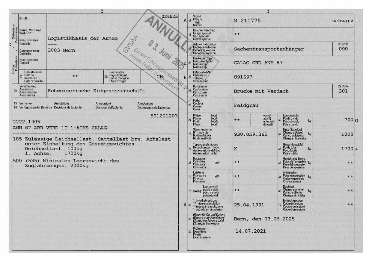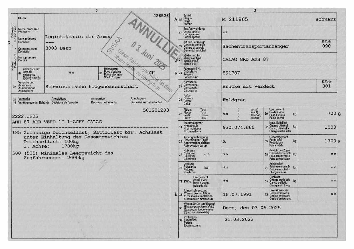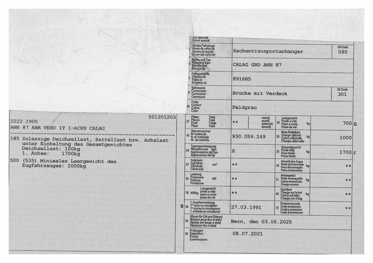 | 12605 | Calang GRD ANH 87 | Tieflader Zivilschutzanhänger erhöhte Blechwände Handbremse Dinöse Stützrolle ab Platz mehr... | 1700 kg | 700 kg | 210 x 110/160 x 20/50 cm | 03.91 | 950.- |