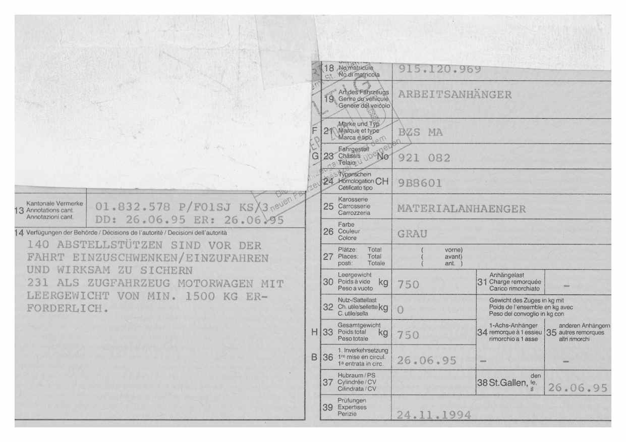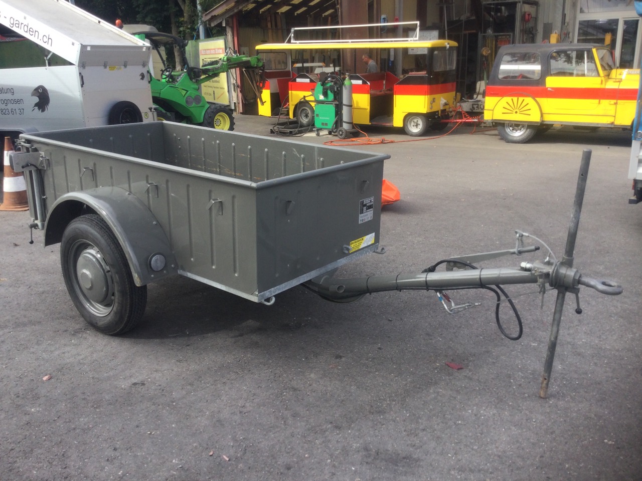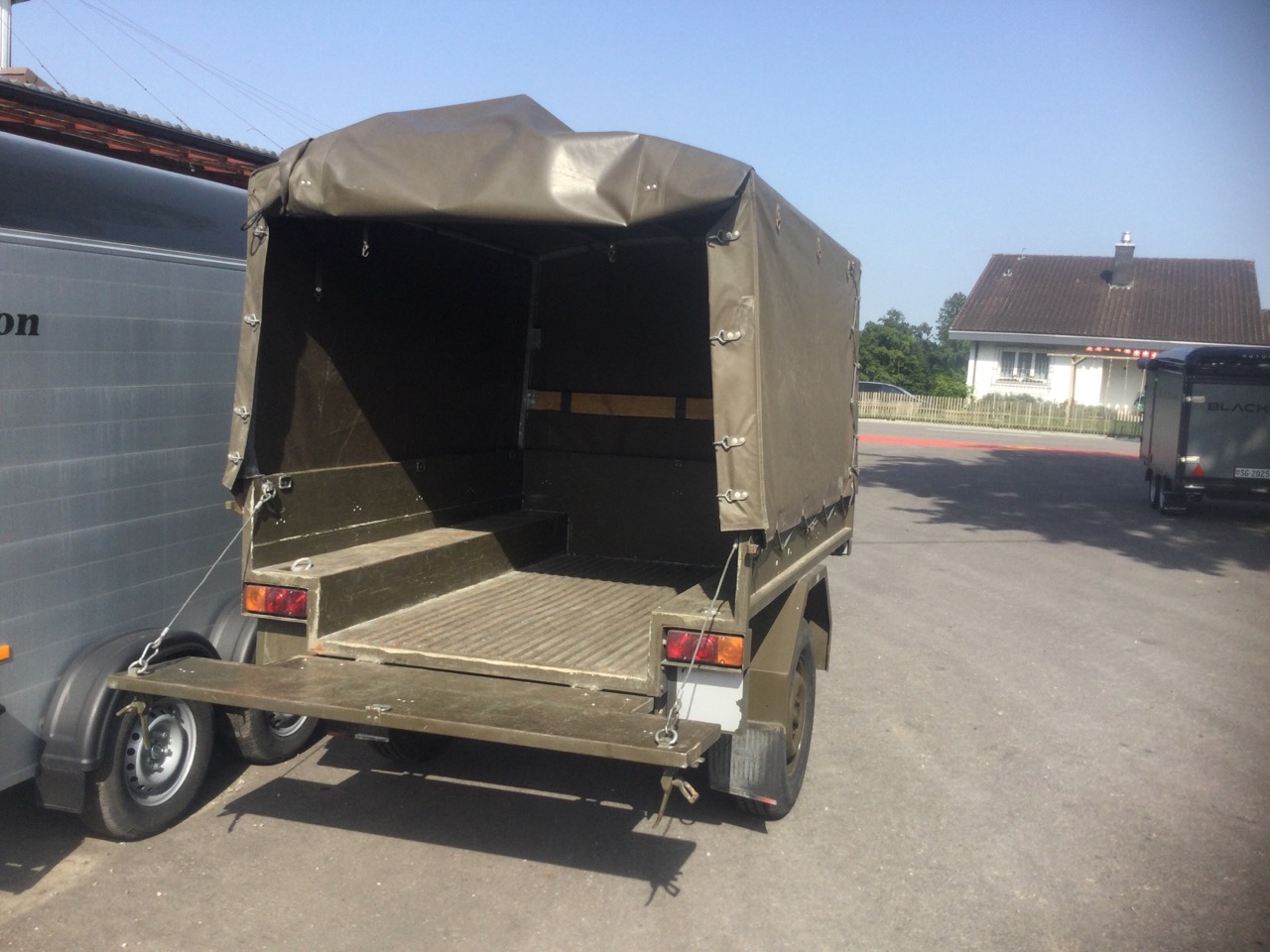 | 12303 | BZS BZS | Tieflader Zivilschutzanhänger erhöhte Blechwände Handbremse Dinöse Stützrolle ab Platz mehr... | 750 kg | 275 kg | 190 x 100 x 50 cm | 07.75 | 550.- |