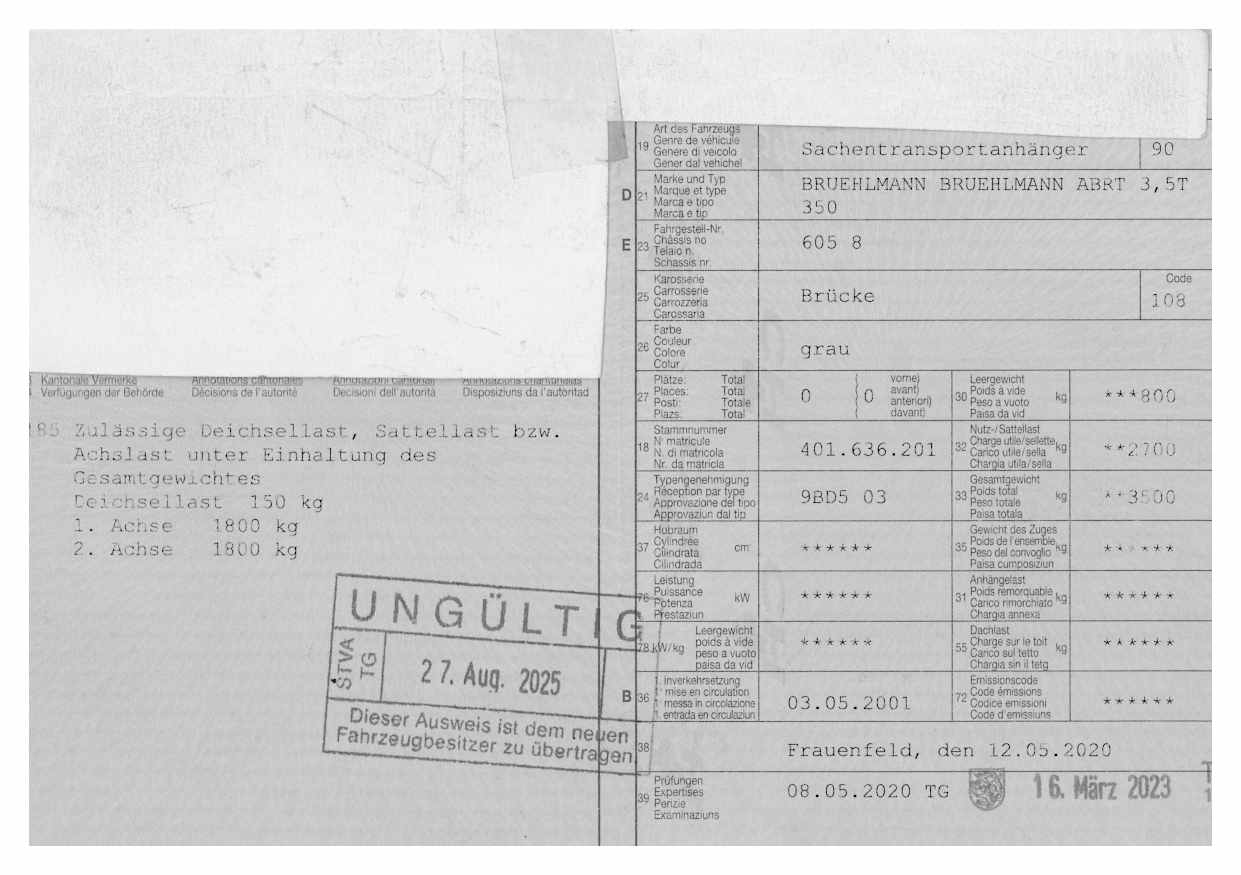 | 12607 | Brühlmann ABRT 3,5T 350 | TL TA Baumaschinen Stahl Holzboden 2 Rampen Heckladen 2 Stützen Dinöse SR Kiste ab Platz mehr... | 3500 kg | 800 kg | 350 x 170 x 39/150 cm | 05.01 | 2'800.- |
