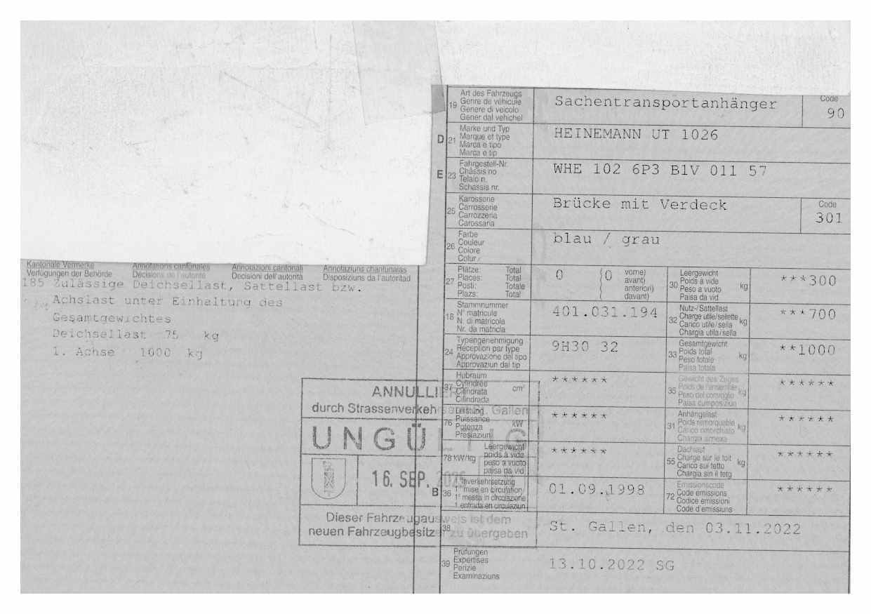 | 11867 | Greuter 2 UG 5 | 4 Rad Drehschemelanhänger CH Druckluftbremse Aluläden ohne Ladung ab Platz mehr... | 4900 kg | 1200 kg | 348 x 165 cm | 08.91 | 2'500.- |