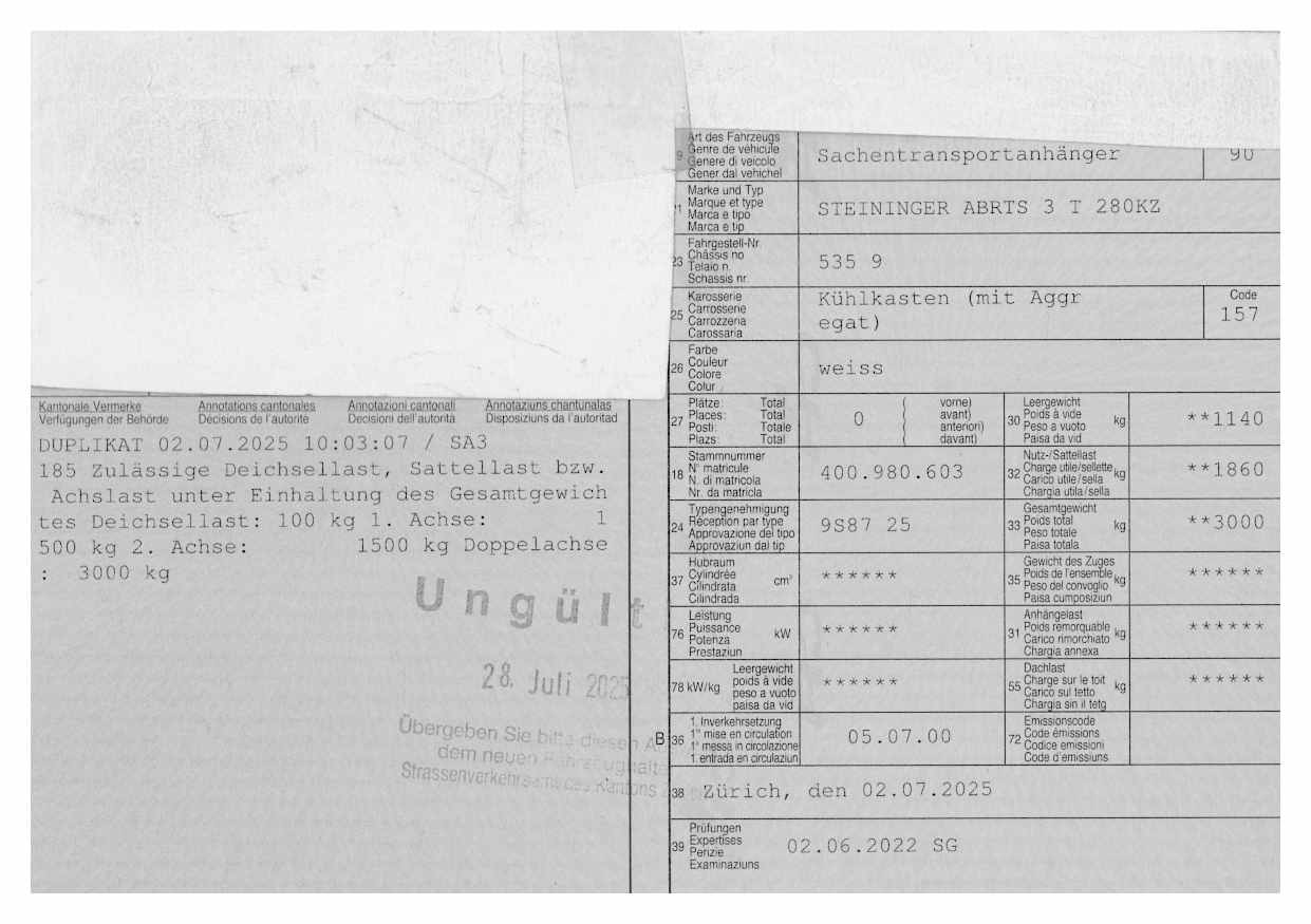| 128 | Steininger ABRTS 3 T 280 - KZ | TL TA Tief/Kühlanhänger isoliert Aggregat def. evt nur bis 0° Einflügeltüre SR ab Platz mehr... | 3000 kg | 1140 kg | 290 x 150 x 177 cm | 07.00 | 3'000.- |