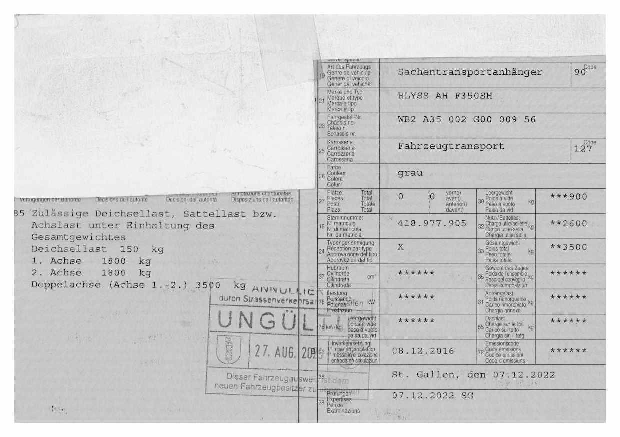 | 8646 | Blyss AH F350SH | Autotransport 2 Auto TA HL Stahlchassis 2 Stahlrampen 2 Alustandschienen Stützrolle ab Pla mehr... | 3500 kg | 900 kg | 800 x 200 cm | 12.16 | 6'500.- |