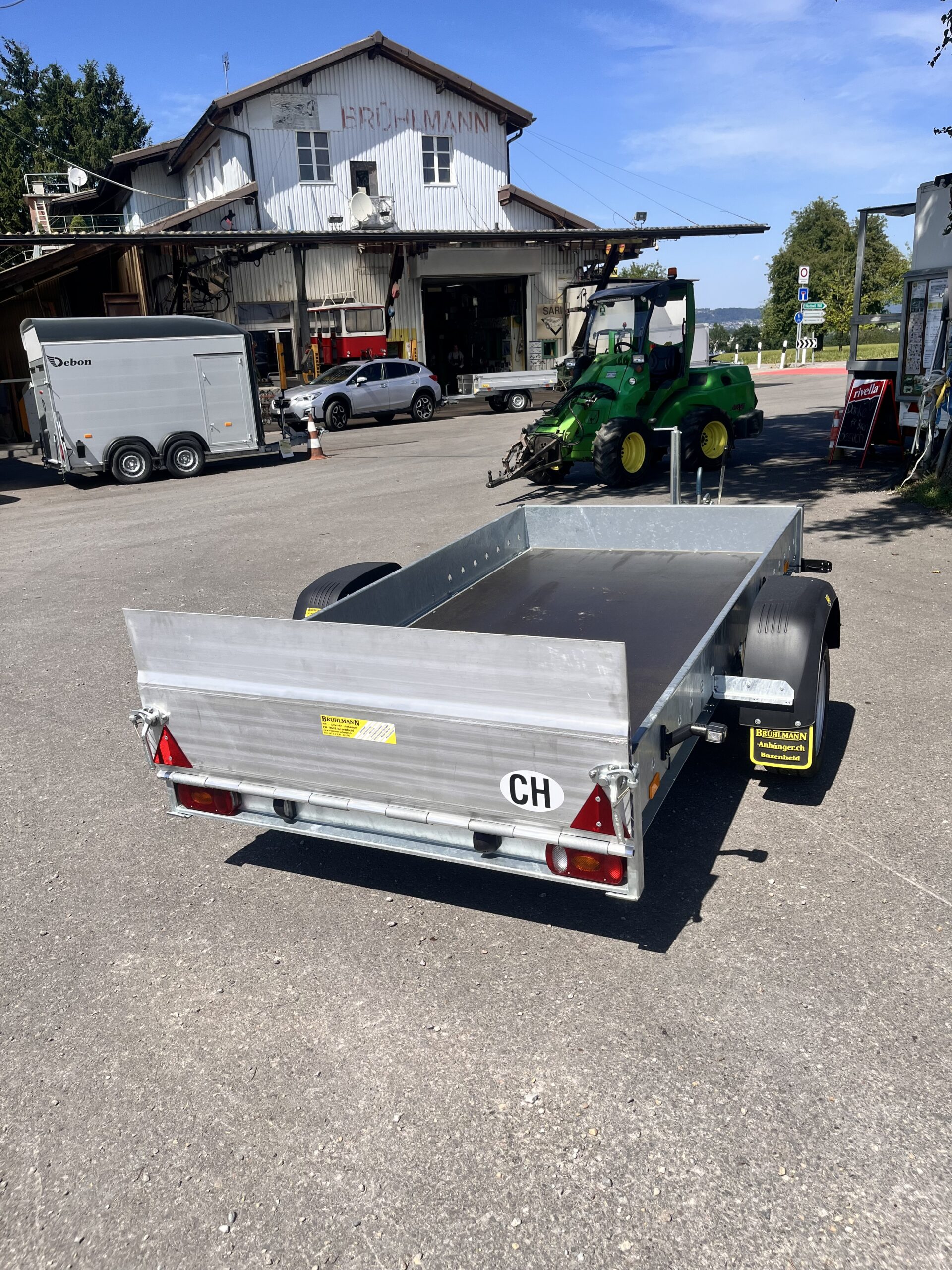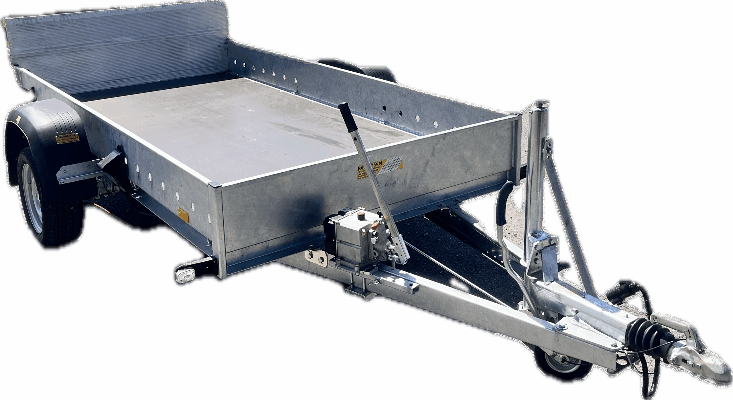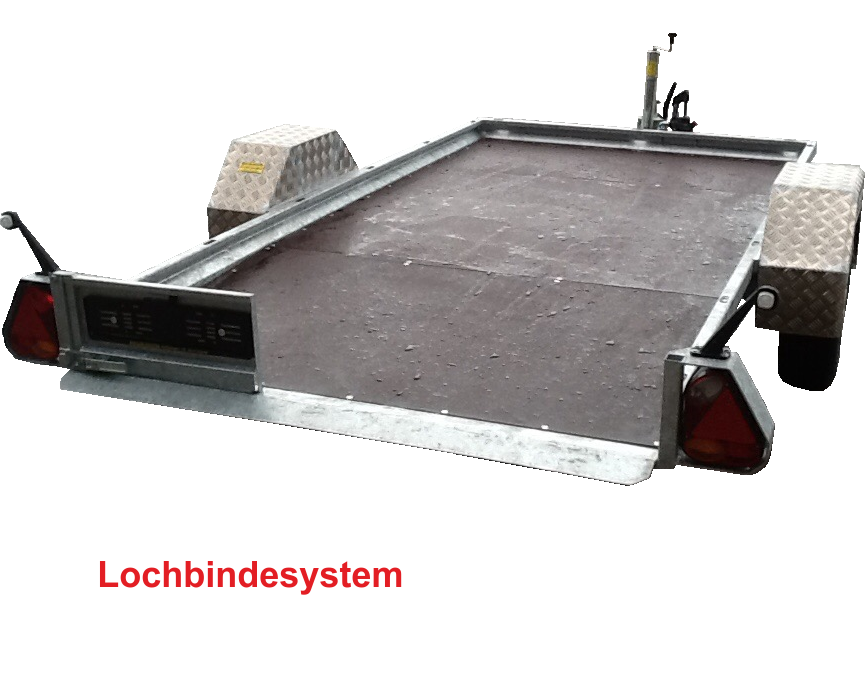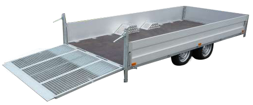 Chassis verzinkt, Stahlbordwände 10 cm, Tieflader Räder neben der Brücke, Siebdruckboden,