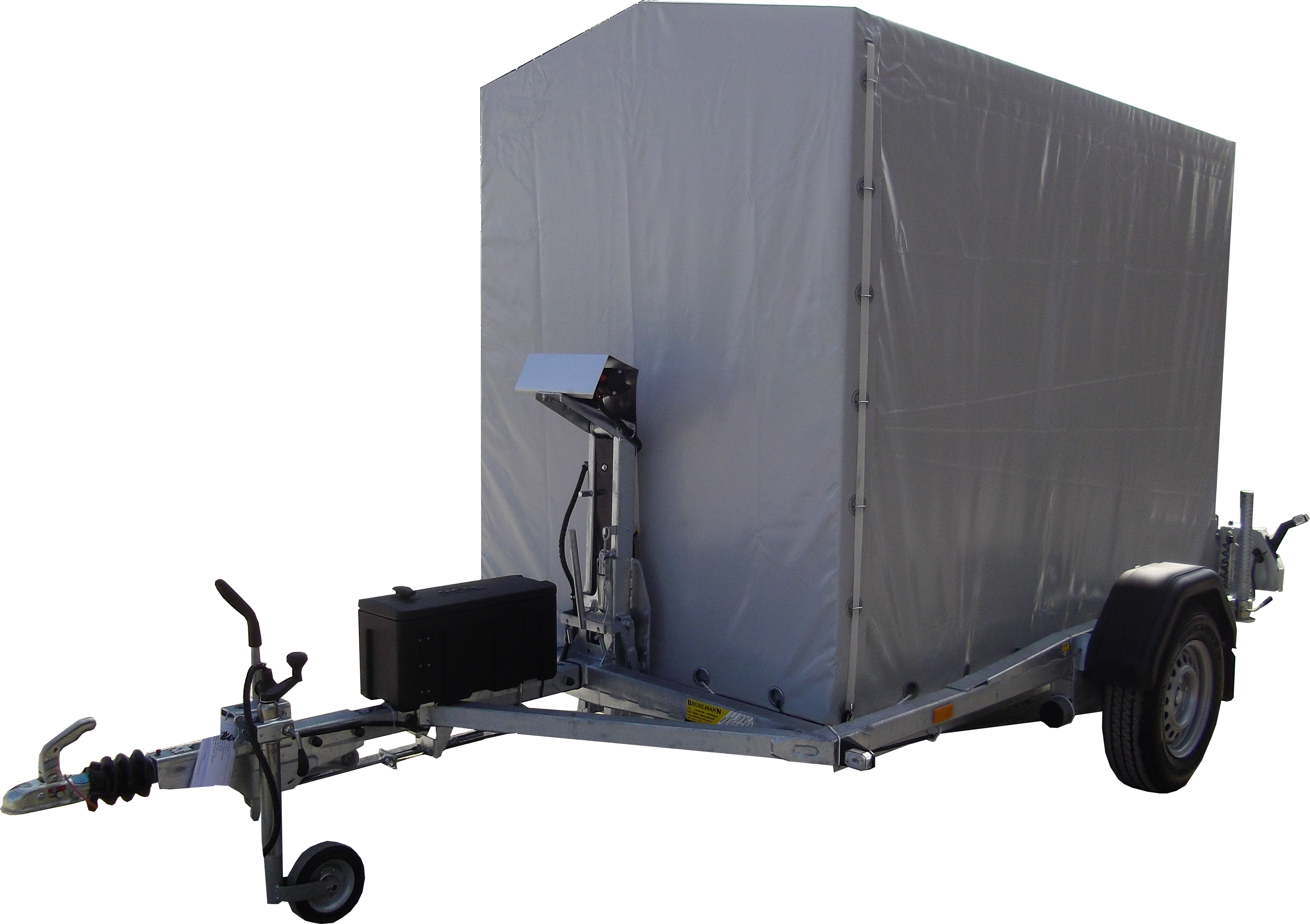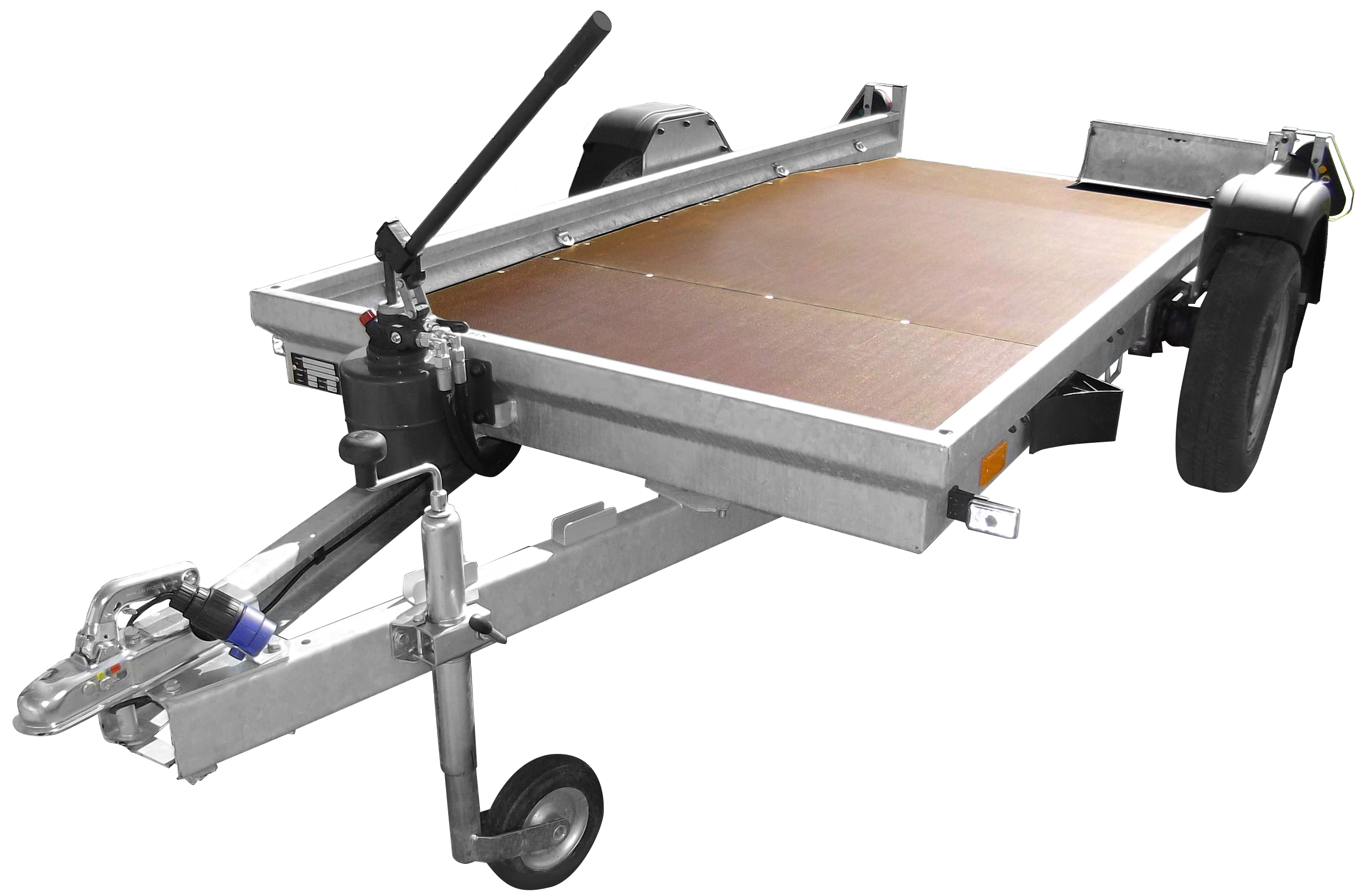 hydraulisch absenkbar Schwenkachse mit Handpumpe, hinten Alurampe, Stützrolle,