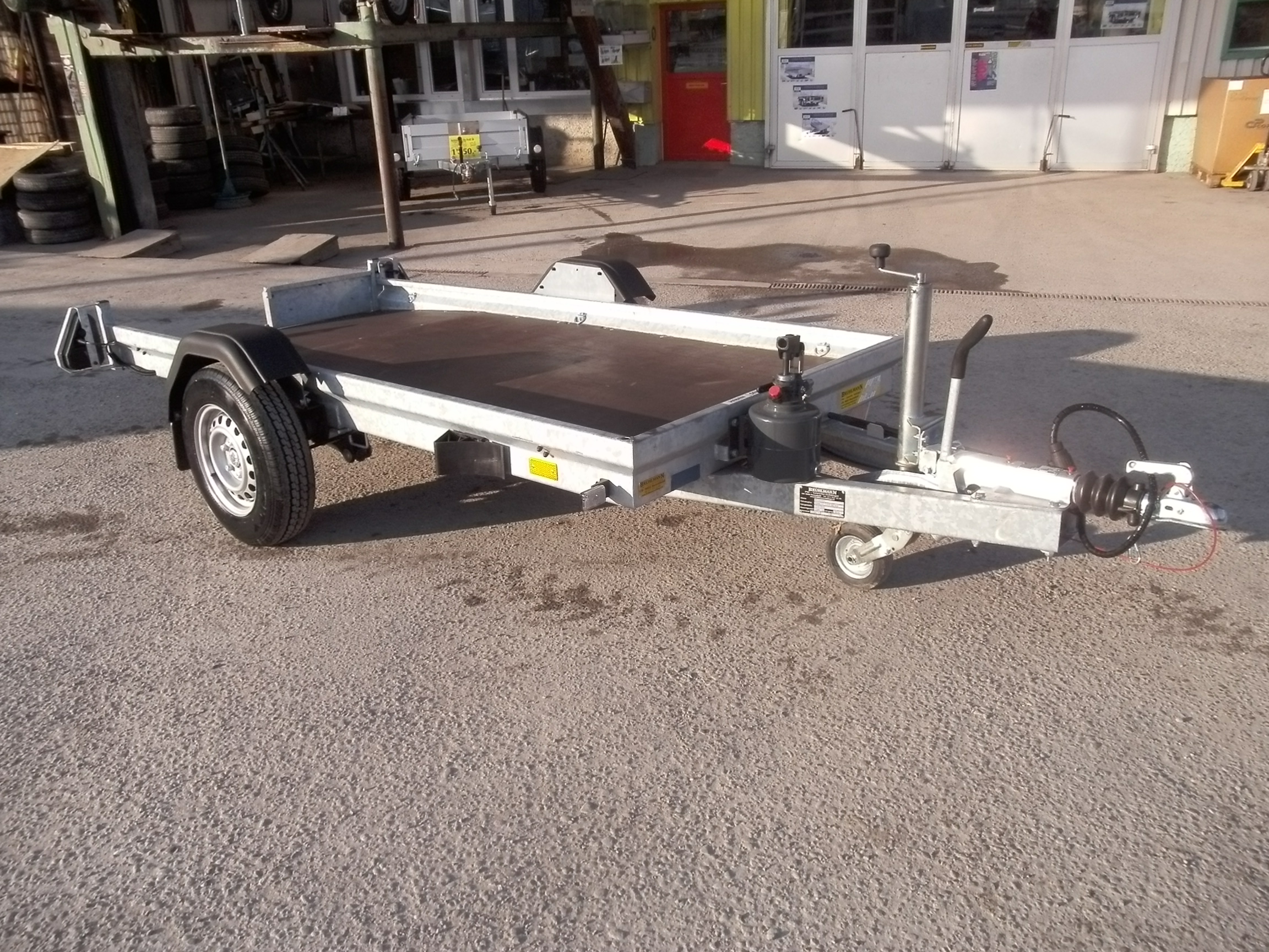 Siebdruckboden, 10 versenkte Binderinge, Auflaufbremse mit Rückfahrautomatik, starke Stützrolle,