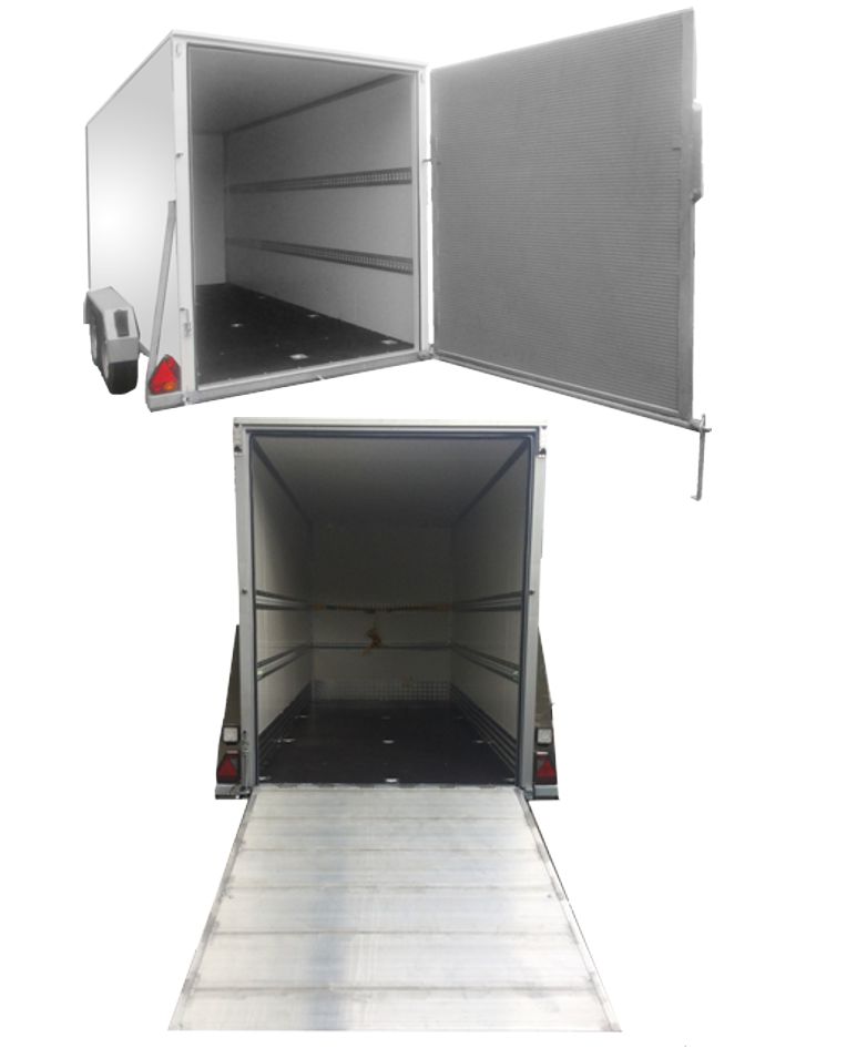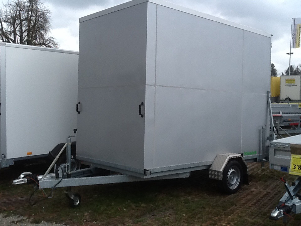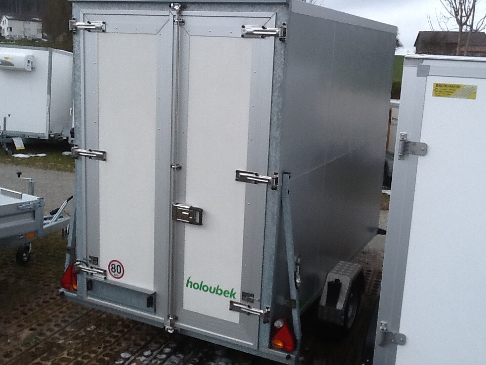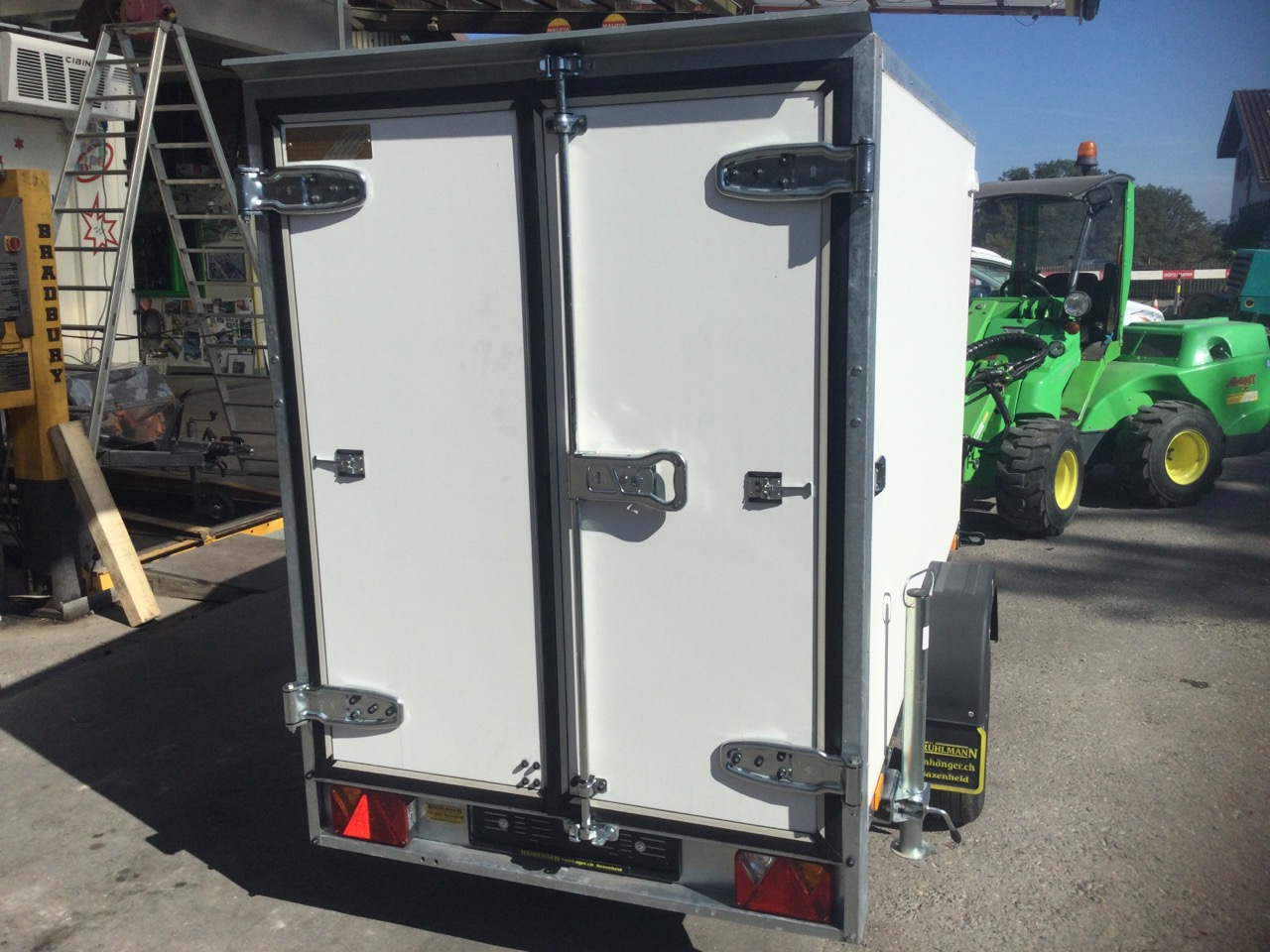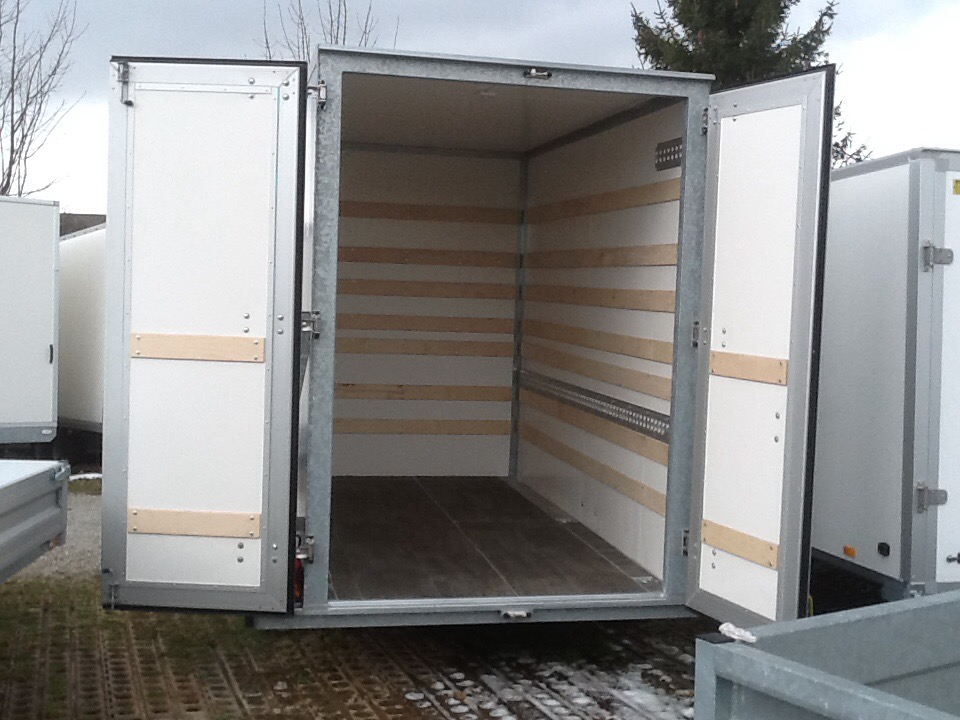 Chassis verzinkt, Sandwichaufbau weiss 30 mm mit eloxierten Aluprofilen eingefasst, hinten Flügeltüre mit Inox – Aufbaudrehstangenverschluss abschliessbar, Siebdruckboden mit Binderinge, 1x Zurrschiene links + rechts, Auflaufbremse mit Rückfahrautomatik, Stützrolle