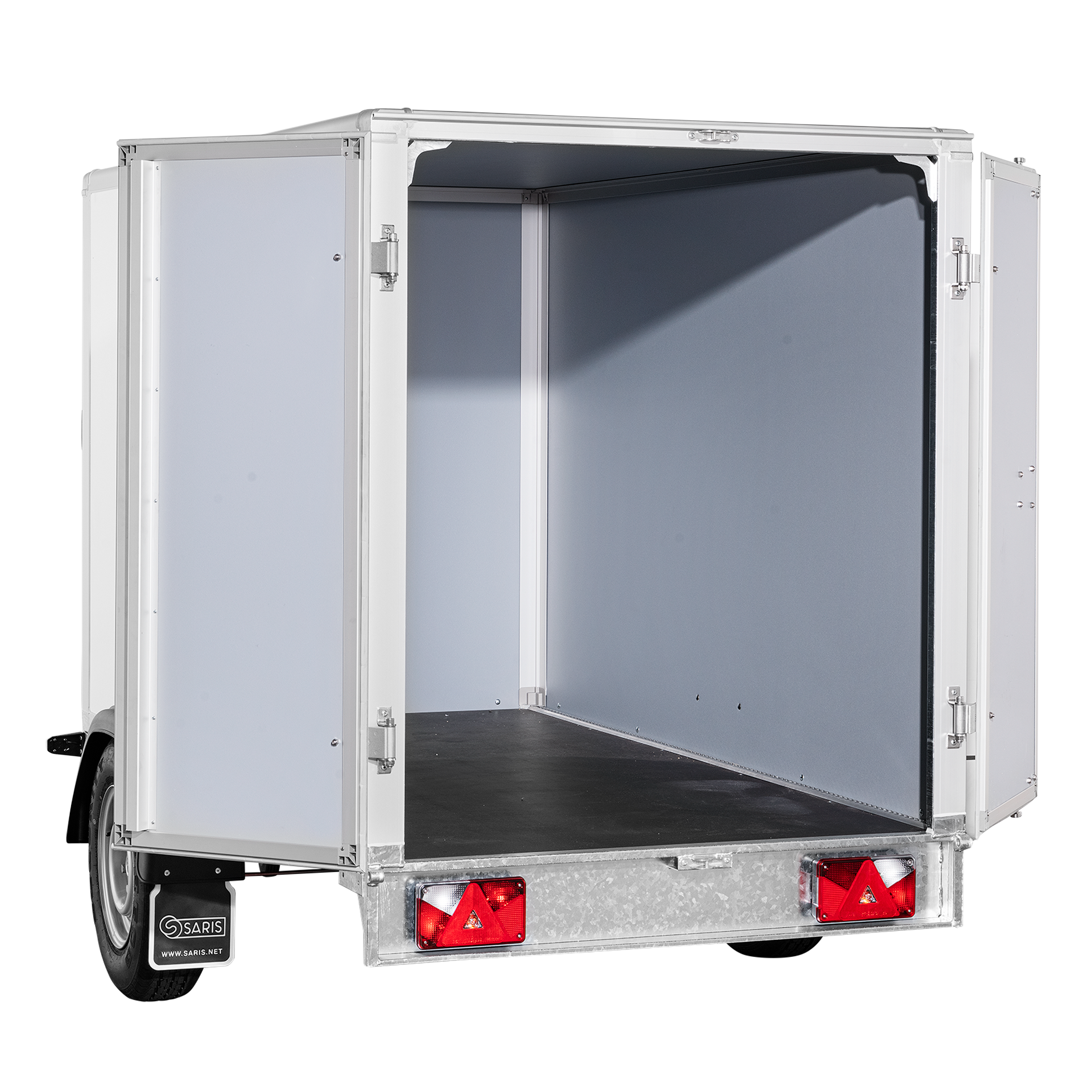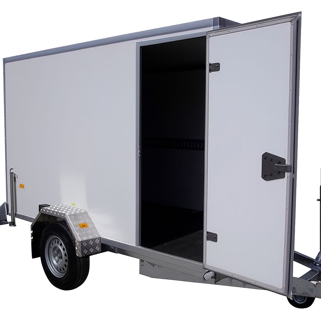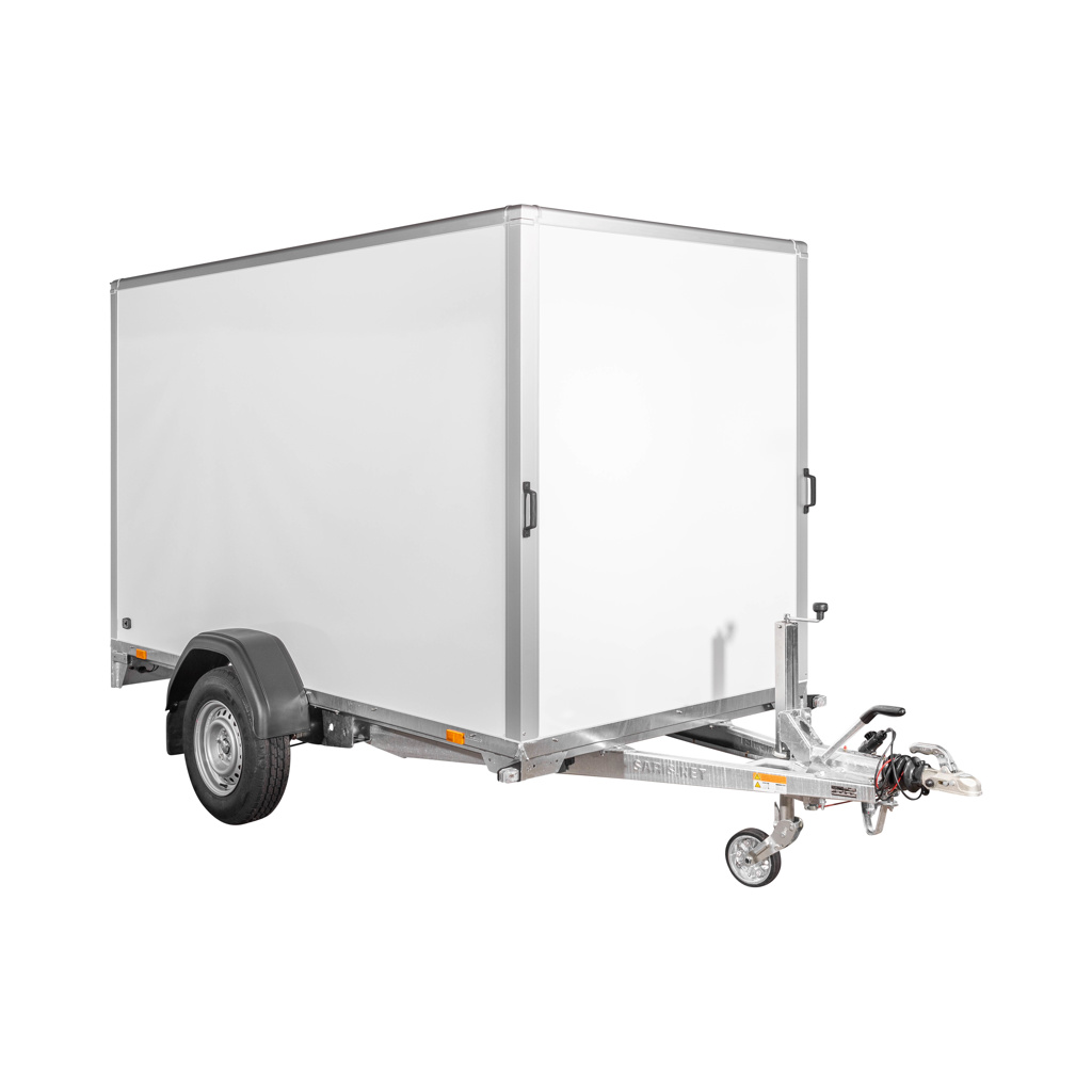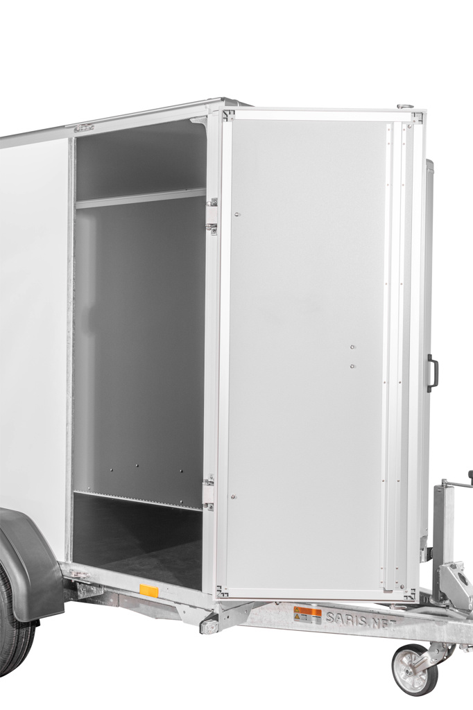 Chassis verzinkt, Sandwichaufbau weiss 30 mm mit eloxierten Aluprofilen eingefasst, hinten Flügeltüre mit Inox – Aufbaudrehstangenverschluss abschliessbar, Siebdruckboden mit Binderinge, 1x Zurrschiene links + rechts, Auflaufbremse mit Rückfahrautomatik, Stützrolle