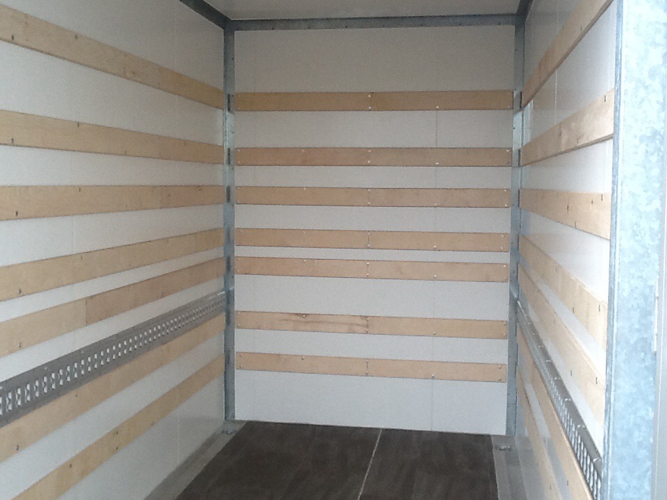 Chassis verzinkt, Plywoodaufbau aussen weiss 15 mm dick, innen silber, hinten Doppeflügeltüre