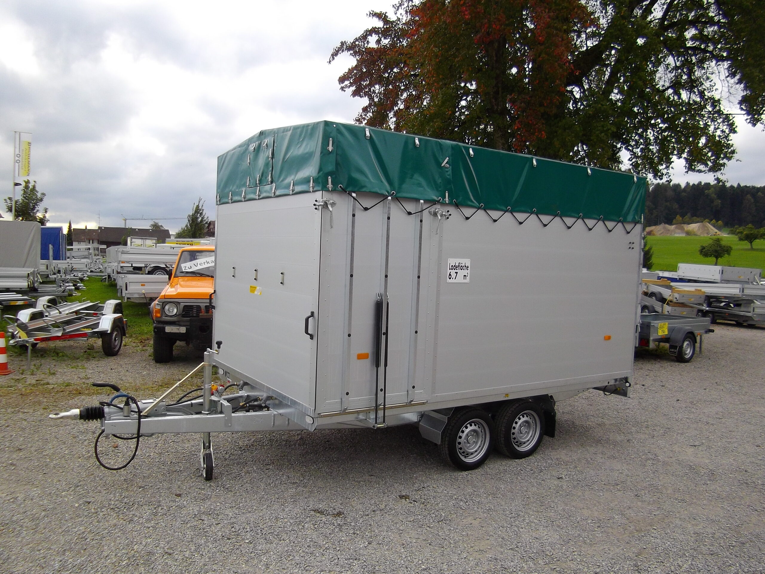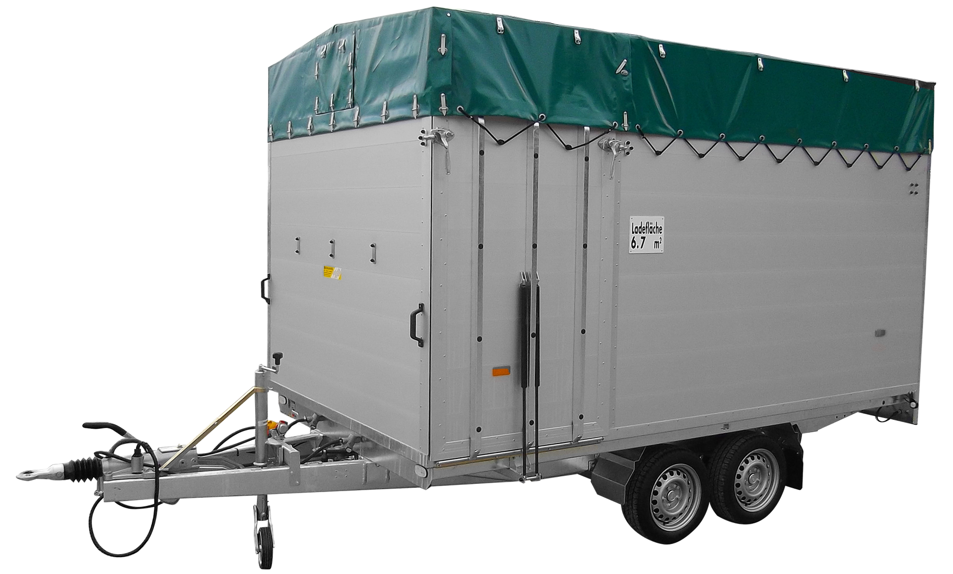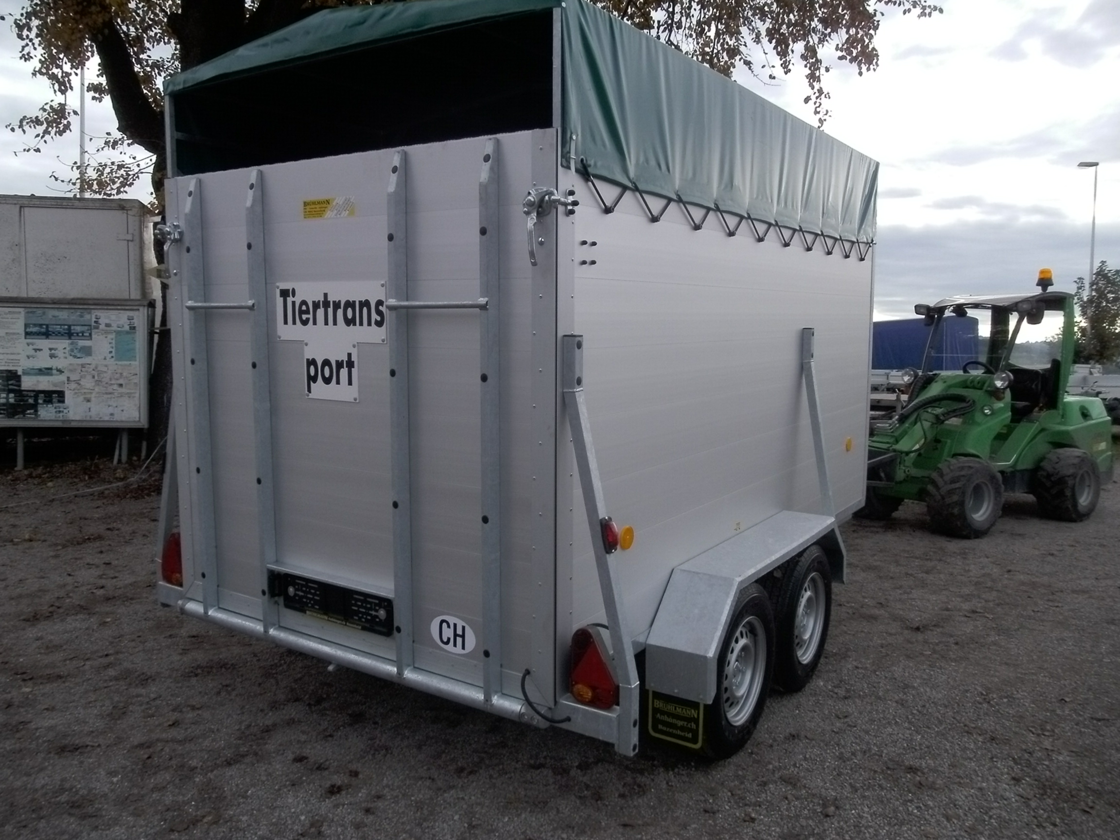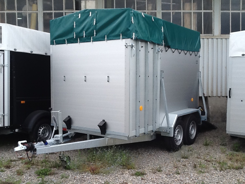 Chassis verzinkt, Tandem, Räder neben der Brücke, Aufbau viereckig, Aluwände 155 cm hoch + Plane